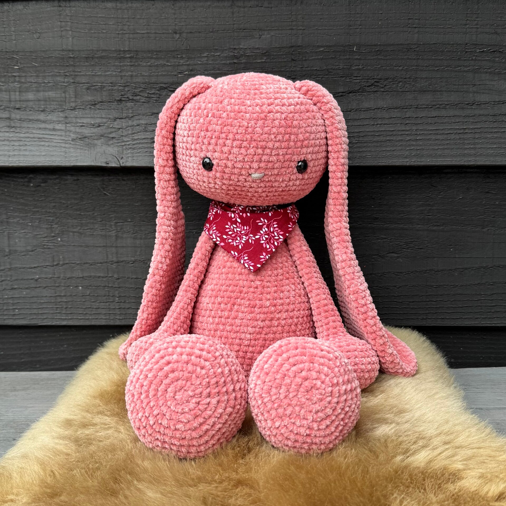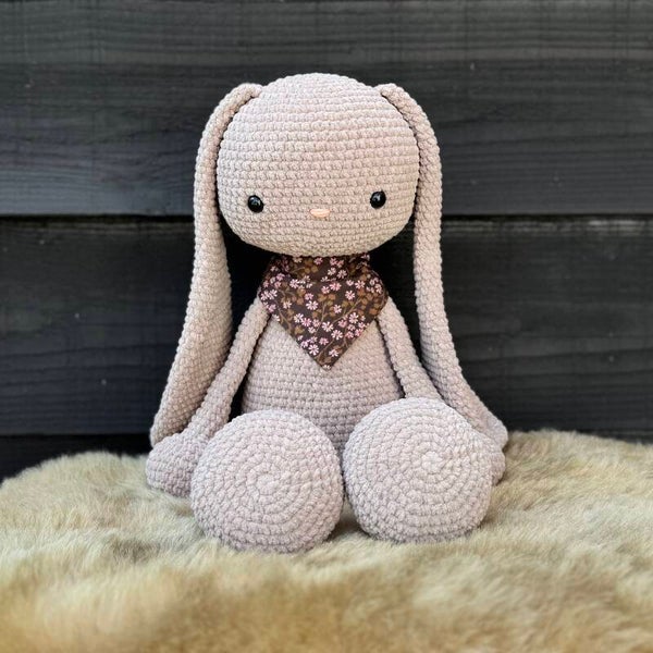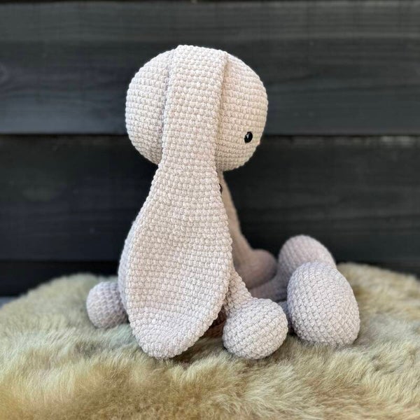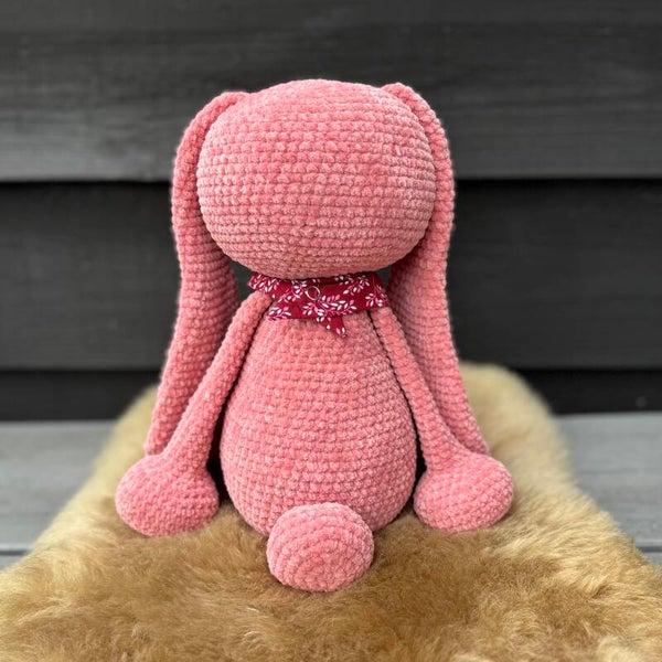 Konijn Bibi dit keer gehaakt met Durable Velvet. Door het gebruik van dit dikke en zachte garen is Bibi XXL zittend ca. 29 cm hoog. De knuffel is gevuld met fiberfill.
