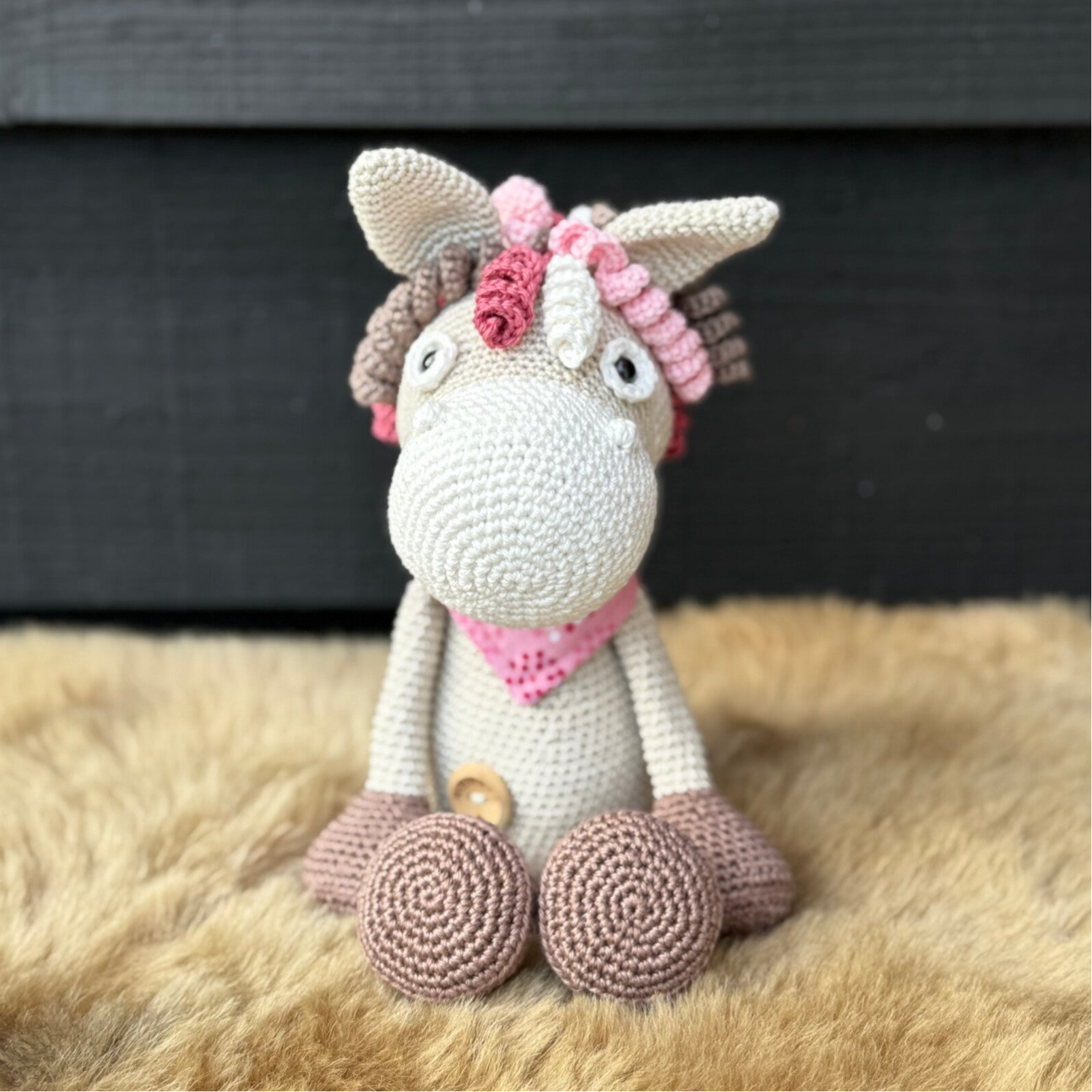Deze ezel is door mijzelf ontworpen en gehaakt van zachte katoen en gevuld met fiberfill.